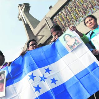 Las mujeres de la caravana “Liberando la esperanza” llegaron a misa con fotos gigantes de sus hijos colgando de su cuello y portando banderas de Nicaragua y Honduras con las que atravesaron el atrio de la Iglesia.