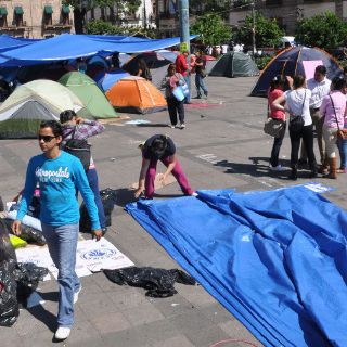 Tras manifestarse este miércoles por las calles y tomar por algunas horas las instalaciones de la Secretaría de Finanzas del gobierno estatal para exigir el pago a más de cinco mil trabajadores docentes eventuales, los inconformes instalaron en la plaza Benito Juárez un plantón que denominaron "campamento informativo".