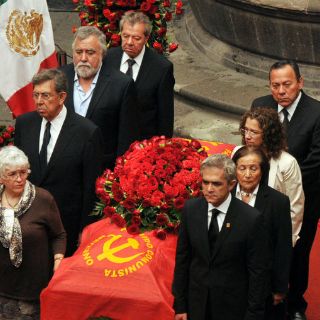 Sobre el féretro del ex líder de las izquierdas, quien murió la víspera a los 88 años de edad, fue colocada una bandera roja del Partido Socialista Unificado de México.