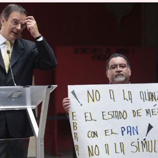 CIUDAD DE MÉXICO (02/MAR/2011).- El jefe de Gobierno del Distrito Federal (izquierda), en la inauguración de la exposición Imágenes e Historia: “La Ciudad y su Registro Público” como parte de los festejos del 140o. aniversario del Registro Público de la Propiedad y de Comercio, esto en la Academia de San Carlos, en el evento una persona mostró un cartel en contra de la alianza del Partido de la Revolución Democrática (PRD), con el de Acción Nacional (PAN), en el Estado de México.