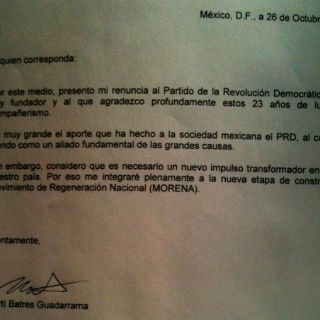 "Por este medio presento mi renuncia al Partido de la Revolución Democrática, del cual fui fundador y al que agradezco profundamente estos 23 años de lucha y de compañerismo", señala en su carta fechada el 26 de octubre.
