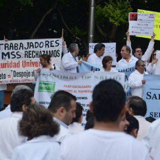 Alrededor de 180 médicos y enfermeras y enfermeros se instalaron este miércoles frente a Palacio de Gobierno después de realizar una marcha por la zona centro de esta ciudad, en contra de la universalización de los servicios de Salud.