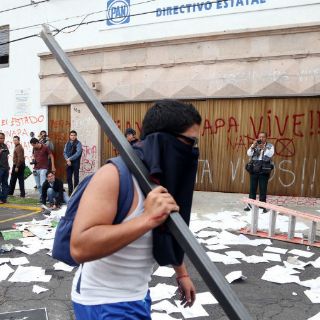 Estudiantes normalistas prendieron fuego a una de las puertas de la sede del PRD, además de realizar destrozos en los edificios del PAN y de Nueva Alianza.