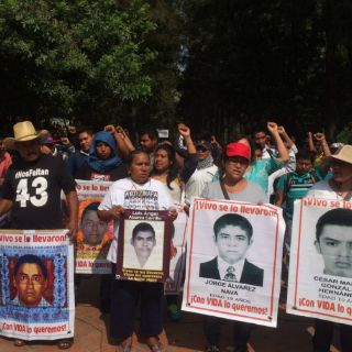 El contingente es encabezado por los papás de los estudiantes, quienes portan pancartas con las fotografías y datos de sus hijos.