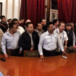 Los panistas, quienes ganaron la gubernatura en las pasadas elecciones en alianza con el Partido de la Revolución Democrática (PRD), se reunieron con los munícipes en uno de los salones de Palacio de Gobierno, donde en la mañana los perredistas colocaron una manta de protesta.
