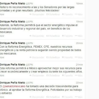 "El @senadomexicano ha tomado una decisión trascendental para México, al aprobar la Reforma Energética. Felicidades por su trabajo y esfuerzo".