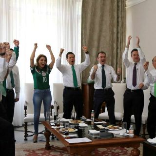 Fiel al compromiso que hizo el 27 de mayo pasado, en Palacio Nacional al abanderar a la Selección Mexicana, el Presidente de la República aparece con corbata verde al lado de su esposa Angélica Rivera de Peña, quien porta la camiseta verde del equipo mexicano.