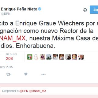 "Felicito a Enrique Graue Wiechers por su designación como nuevo Rector de la @UNAM_MX, nuestra Máxima Casa de Estudios. Enhorabuena.", escribió el Mandatario en su cuenta de Twitter @EPN.
