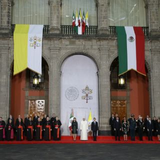 Tras su entrada al Patio Central del inmueble, se escucharon los himnos nacionales de México y El Vaticano.