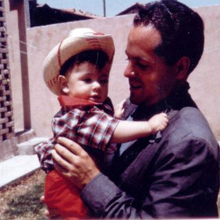 A través de sus redes sociales, Peña Nieto compartió una fotografía en la que que se le ve cuando era pequeño, vestido con sombrero y camisa de cuadros, en brazos del señor Peña del Mazo.