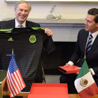 Texas, Greg Abbott, en la residencia oficial de Los Pinos, el mandatario mexicano le regaló una playera de la Selección Mexicana de Futbol.