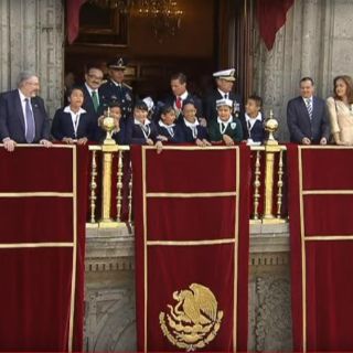 En el balcón de Palacio Nacional también acompañan a Peña Nieto un grupo de niños quienes presencian este desfile militar, que por primera vez cuenta con grupos comandados por mujeres militares.