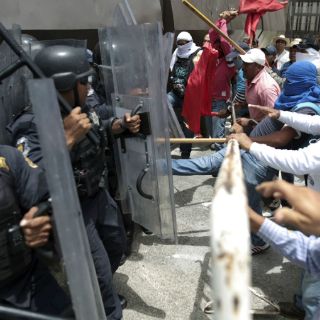 Guerrero (CETEG) , apoyados por otras organizaciones, se enfrentó este miércoles a unos 40 policías antimotines que resguardaban de la protesta al palacio de gobierno.