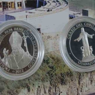 En una de sus caras tiene la imagen del Pontífice con un báculo en la mano izquierda y la leyenda "Primera Visita del Papa Benedicto XVI a México 2012" y en la otra el Cristo Rey de Montaña con la frase "Cerro del Cubilete, Guanajuato".