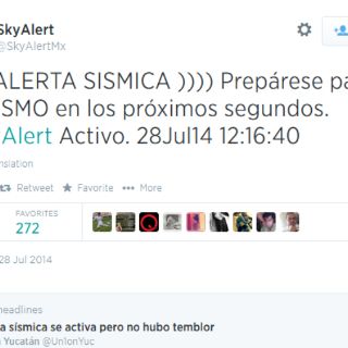 "Alerta sísmica. Prepárese para un sismo en los próximos segundos. #SkyAlert Activo. 28 Jul14 12:16:40".