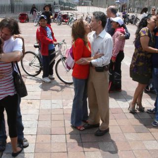 LEÓN, GUANAJUATO (05/AGO/2012).- Diez parejas, entre novios y matrimonios, se besaron este domingo en la Plaza Expiatorio en un abierto desafío al gobierno municipal por la detención y encarcelamiento del maestro Manuel Berumen, el jueves pasado, acusado de incurrir en falta administrativa por besar a su esposa en la vía pública.