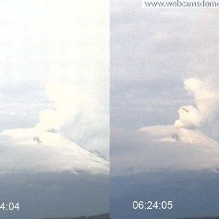 En una imagen tomada a las 06:24:04 se observa un objeto de forma alargada en la parte superior izquierda de la foto. Un segundo después (06:24:05) el objeto aparece con una forma menos larga ya sobre el cráter del volcán y una captura posterior, a las 06:24:06, ya se aprecia más cargado al lado derecho.