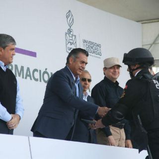 Posteriormente el mandatario estatal encabezó en la Universidad de Ciencias de la Seguridad, en el municipio de Santa Catarina, la ceremonia de graduación de 318 nuevos policías estatales, de los cuales 245 se incorporarán a la policía acreditada Fuerza Civil, 38 se desempeñarán en Protección Institucional, y 35 serán guardias y custodios penitenciarios.