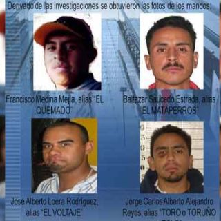 Los cabecillas de la célula criminal fueron identificados como Francisco Medina Mejía, 'El Quemado'; Baltazar Saucedo Estrada, 'El Mataperros'; José Alberto Loera Rodríguez, 'El Voltaje' y Jorge Carlos Alberto Alejandro Reyes, 'El Toro', 'Toruño' o 'Tolo', indicó.