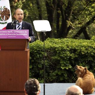 Esta mañana, el labrador Golden Retriever se plantó a un lado del atril y ahí se quedó observando al Presidente Felipe Calderón.