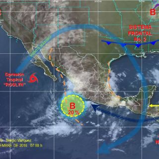 CIUDAD DE MÉXICO (29/SEP/2016).- El Servicio Meteorológico Nacional (SMN) informó que la depresión tropical ''Roslyn'' disminuyó la intensidad de sus vientos y ahora es una baja remanente al oeste de Baja California Sur, por lo que avanza sin afectar las costas mexicanas.