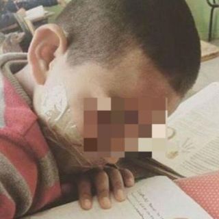 La fotografía fue subida por la maestra Ahisury Flores Hernández en su cuenta de Facebook. En la imagen el menor estaba trabajando en un cuaderno, con una cinta color canela en su boca.