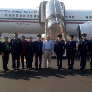 Mientras en un iPod sonaban "Las golondrinas", la tripulación posó para la foto del recuerdo con el titular del Ejecutivo Federal antes de despedirse de él, luego del último vuelo que realizó en el TP10 como Presidente de México.
