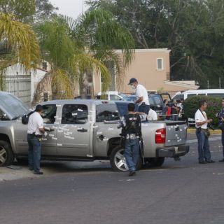 En el lugar fue localizada una camioneta Chevrolet Pick up, de cabina y media, blanca, modelo 2004, con placas de circulación de Illinois, Estados Unidos, en cuyo interior había armas cortas, municiones de diversos calibres y dos chalecos antibalas.