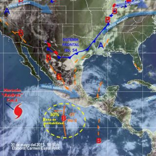 En cuanto al huracán “Andrés” de categoría 2 en la escala Saffir-Simpson se informó que se localiza aproximadamente a mil 125 kilómetros al suroeste de Cabo San Lucas, Baja California Sur, y a 720 km al suroeste de Isla Socorro, Colima.