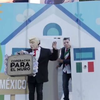 En tan sólo 42 segundos, jóvenes disfrazados ubicados en la avenida Sevilla de la Ciudad de México, representan la visita del candidato presidencial demócrata, Donald Trump a México.