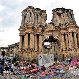 Las ruinas de la iglesia Del Carmen decoran el marcado de artesanías. Los marchantes tienden sus artesanías en el suelo para que sean vistas por el turista. Encuentras variedades de hupiles, blusas de coloridos bordados, juguetes en madera, zapatos, muebles y joyería en jade. Calle Cristóbal Colón.