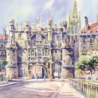 Otro punto que vale la pena lo puedes disfrutar en la acuarela de esta semana: El Arco de Santa María, que data del Siglo XIV. La fachada es una de las puertas que tenía la ciudad y una de las que mejor se conserva en Europa. Une el puente de Santa María (sobre el río Arlanzón) con la Plaza de San Fernando, donde se encuentra precisamente la Catedral de Burgos.