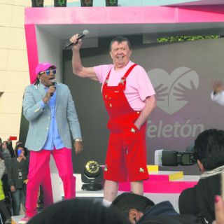 Con su característico overol rojo y una playera color rosa claro en el “backstage” se tomó fotos con los integrantes de la agrupación antes de iniciar las transmisiones de la edición número 19 del Teletón, que comenzó ayer a las 08:00 horas en esa locación.