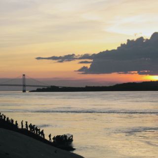 Las siluetas de decenas de jóvenes que hacían fila para cruzar el enorme río en un pequeño lanchón; el puente de Angostura al fondo, y el Sol ocultándose entre las nubes, además de dar un toque romántico al panorama, nos permitieron captar una escena típica de la vida diaria en aquel lugar de la Guayana venezolana.