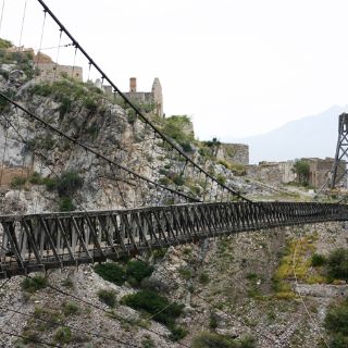 GUADALAJARA, JALISCO (24/OCT/2010).- Pendiente de dos enormes torres de madera cuelgan los cientos de metros de cables, varillas, tensores, tablones y vigas del soberbio puente colgante que une la boca de la mina de Ojuela -encaramada en la ladera de un cerro- con la cima de la montaña de enfrente, que es desde donde se inicia la famosa planicie semidesértica del interesante Bolsón de Mapimí.