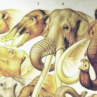 En ésta “foto de familia”, aparece en la fila superior: el segundo de izquierda a derecha (5). El siguiente es un estegodonte, seguido por un mamut (8). El de la izquierda (1) es un moeriterium, que es el más antiguo. En la parte inferior, muy extraño y con sus colmillos inferiores hacia abajo aparece el deinotherium. (2)