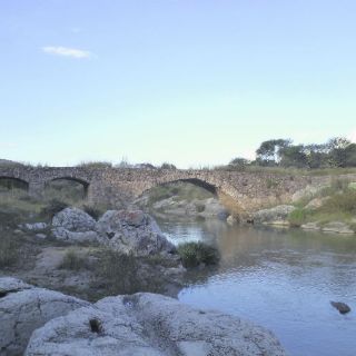 Luego nos sentamos sobre unas piedras para deleitarnos del paraje que enriquecía al puente, lomas cubiertas por diversa vegetación. Tres bellos arcos escarzanos de piedra conforman el puente, un arco grande comprende el claro del lecho y después le siguen dos medianos arcos de medidas un tanto similares en su claro y diferentes en su altura, debido a la pendiente del puente, que baja al primero o último arco, como se quiera ver.