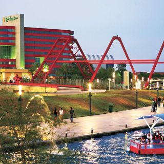 El Paseo Santa Lucía se puede visitar cuando los rayos del Sol se van. Los camellones se iluminan y el río se alumbra con luces de neón.