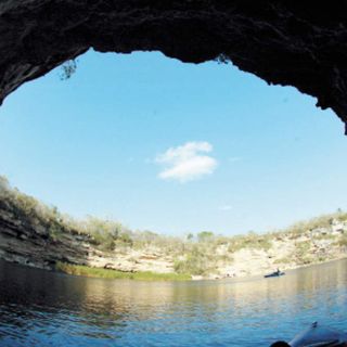 Allá abajo se ha formado una poza que en tiempos de lluvias se convierte en un lago. Un río corre a través de una caverna de 800 metros, mismos que se caminan con la ayuda de una linterna y mismos en los que uno puede ver peces ciegos y descoloridos, golondrinas, arañas y hasta serpientes.