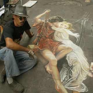 Una serie de gises bastó para que despertara del sueño, llevándolo a sumergirse en una realidad soñada, la que hoy vive a diario en un viaje itinerante por las calles de ésta y otras ciudades, cargando una maleta con imágenes, un enorme estuche de tizas de colores, un par de bancos plegables y unos pequeños conos para señalar el marco de su obra de arte.