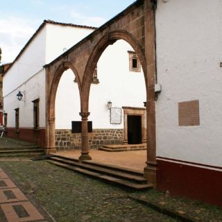 A la entrada de la casa se encuentra un arco –otorgado por la dependencia de Artes Públicas moreliana en 1971– que da la bienvenida al turista; al fondo puede apreciarse un amplio mural diseñador por el artista guanajuatense José Luis Soto González, que impregnó la imagen de don Vasco de Quiroga, colocando a sus pies posan un grupo indígena en representación de la “desesclavitud” que dio a las etnias.