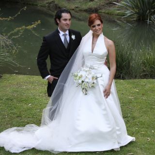 Destacó la belleza de la novia con un modelo para ella de la Casa Jesús Peiro en Barcelona, en raso con ensamble de exquisito Chantilly que se quitó en la recepción, discreto tocado de la misma firma, completando su arreglo con aderezo de esmeraldas y brillantes, regalo de su abuelita STELLA GREGORY DE ÁLVAREZ DEL CASTILLO.