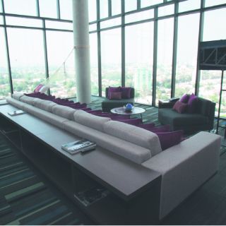 La médula del hotel, a decir de su gerente, es su lobby. Es un punto de reunión donde confluyen su área de comida, la recepción y el bar. Con diferentes sitios a lo largo de este espacio para reposar, comer o trabajar, Aloft se convierte en un rincón versátil. “Queremos romper esquemas, la idea es que el huésped tome su café, sus alimentos o trabaje donde mejor le parezca, ya sea en un sillón con vista a la avenida, un cómodo sofá a la orilla de la recepción o sus mesas y sillas a manera de comedor”.