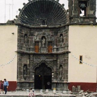 Miguel J. Malo y F. León de Vivero escribieron: “El padre Luis Felipe Neri de Alfaro invirtió apreciable porción de su patrimonio en fabricar esta iglesia. La portada es churrigueresca, incipiente -esboza estípites tallados-, expira en amplia concha, común en San Miguel de Allende, donde corona hornacinas, nichos, fuentes y pilas de abluciones. Sin embargo, dicho motivo arquitectónico no se popularizó en América. La existencia, aquí, de inmensos mantos de cantera tallable explican trabajos de esa especie, como los sillares de Arequipa justifican la bella labra de sus portadas… Escuadran la puerta de madera cuarteronada laboriosos herrajes. La torre, no concluida, es de un solo cuerpo. La linternilla semeja una tuna y finaliza la cúpula de vidriada cerámica azul y amarilla. Los altares de cantera de Tlaxcalilla y estilo neoclásico desplazaron a los áureos retablos.