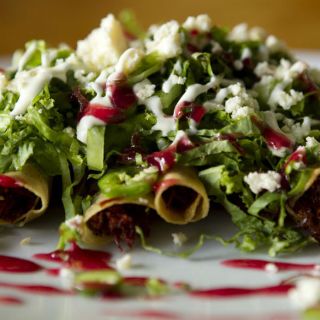 Están los sopes, las flautas bañadas en salsa con un remate de finas tiras de lechuga, crema y queso fresco, también tienen lugar las tostadas de pata, picadillo o pollo deshebrado.