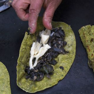 Llegué a un puesto de buena pinta, con algo de comensales y me senté en una de sus bancas gastadas de tanto hambriento y glotón que ha pasado por allí. Con curiosidad pedí un par de quesadillas, una de flor de cabalaza y otra de cuitlacoche. El cocinero me las sirvió con una sonrisa que se debía a que durante su jornada laboral la fortuna había ido generosa con él, y le había llegado “muchos” clientes.