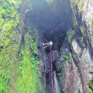 En esta grieta de la tierra, formada por movimientos tectónicos, se cuelgan las cuerdas para los descensos. Son tres rappeles en total: uno de cuatro metros (para calar al espíritu valiente); otro de 20 metros y el último de 15 metros. En los descensos más profundos, en temporada de lluvias, los expedicionarios tendrán que bajar en medio de una cascada.