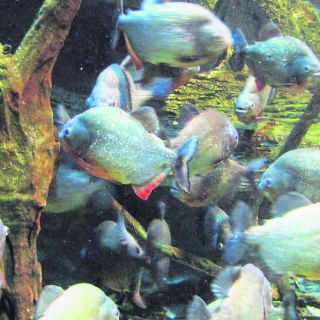 La famosa, publicitada y temida Piraña (Serrasaminae) es la estrella del escenario amazónico. De unos 30 centímetros de largo, barrigona, dientuda y agresiva, que ante el mínimo olor a sangre o debilidad, junto con su grupachón ataca insaciable y ferozmente para devorar con sus afilados dientes triangulares cuanto se le ponga enfrente. La piraña, que es también un delicioso bocado para los humanos, la buscan con sus redes de pesca. En una ocasión pusimos una pequeña rama del tamaño de un lápiz en la boca de una de ellas que ya iba para la cazuela, y el pedazo de palito que quedó entre sus dientes desapareció en segundos ante nuestros ojos atónitos. Dedujimos que ciertamente no era una buena compañera para los aqua-aeróbics que pretendíamos.