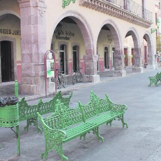 Admiramos el primer portal, el Escobedo, que inicia con una esquina ochavada o a 45º, con un marco arqueado en su puerta y otro en su segundo nivel, enmarcado por columnas redondas y capiteles jónicos, rematados por un frontón triangular, en su interior leímos: “LA NACIONAL”, le sigue una barbicana con balaustrada y almenas. De la esquina continúa el portal, con cuatro claros dóricos y en el segundo piso corresponden en cada claro, dos puertas con balcón corrido de elaborada forja. Las puertas laterales fueron rematadas por frontones triangulados y las centrales por círculos. El cornisamento es dentado, con vistosos círculos y almenas con volutas. El portal aledaño, el Berumen, nos mostró una fachada colonial con una preciosa arcada de cuatro arcos en medio punto, soportados por columnas cuadradas. En altos apreciamos un romántico balcón corrido sostenido por labradas canteras con volutas; el balcón liga con cuatro puertas, rematadas por alegres y complejos relieves; más arriba, 10 gárgolas y una sencilla cornisa.