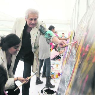 Minutos antes, Colunga tomaría la brocha para intervenir tres lienzos blancos que progresivamente se llenaron de color, estuvo acompañado por los estudiantes quienes tuvieron la libertad de trazar pinceladas junto al artista que no dejó de animar a los menores a sumarse a la creatividad y entusiasmo, al arte.